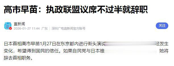 1月26日,高市早苗在一档电视节目中公开表示,如果外部势力在台海区域遭遇攻击,日本“不能逃避责任”,否则其与美国的同盟关系将会瓦解。